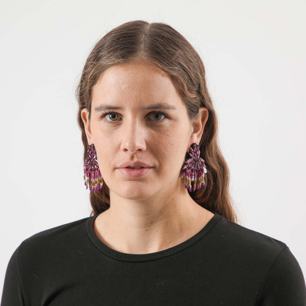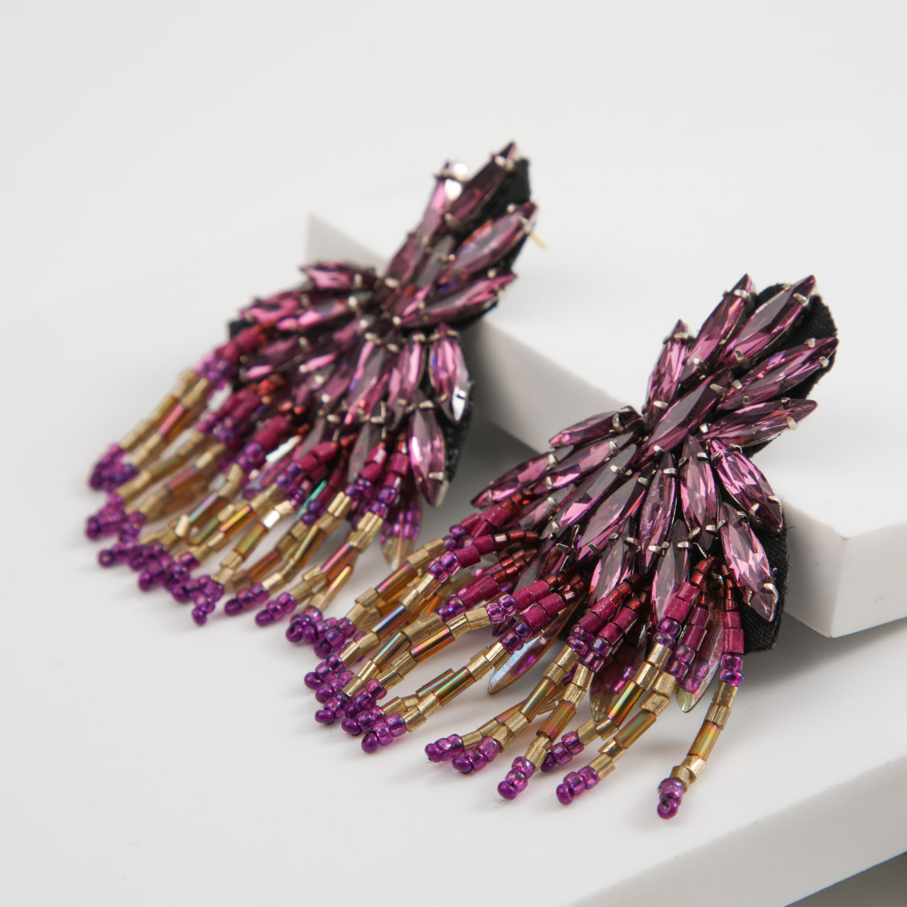 Aro largo de brillantes de fantasía de espiga morados con flecos de mostacillas moradas y doradas.