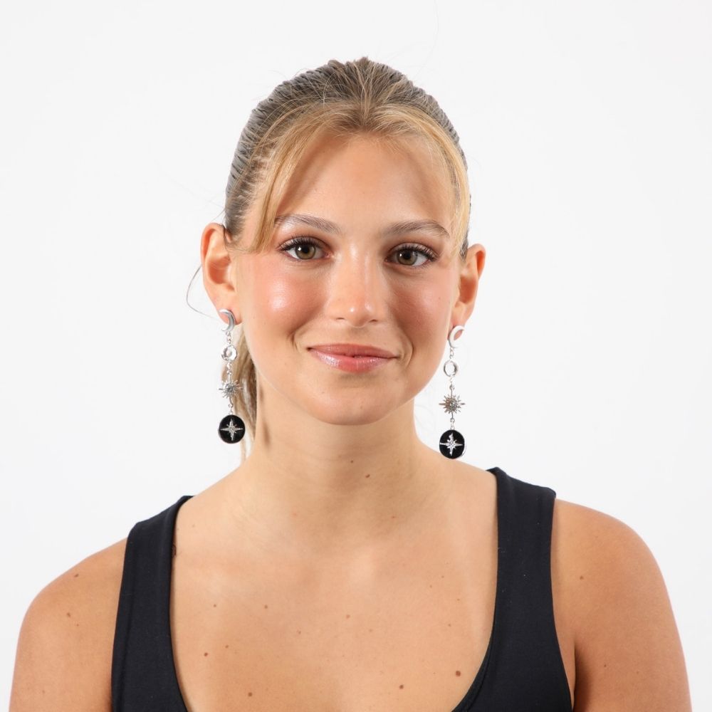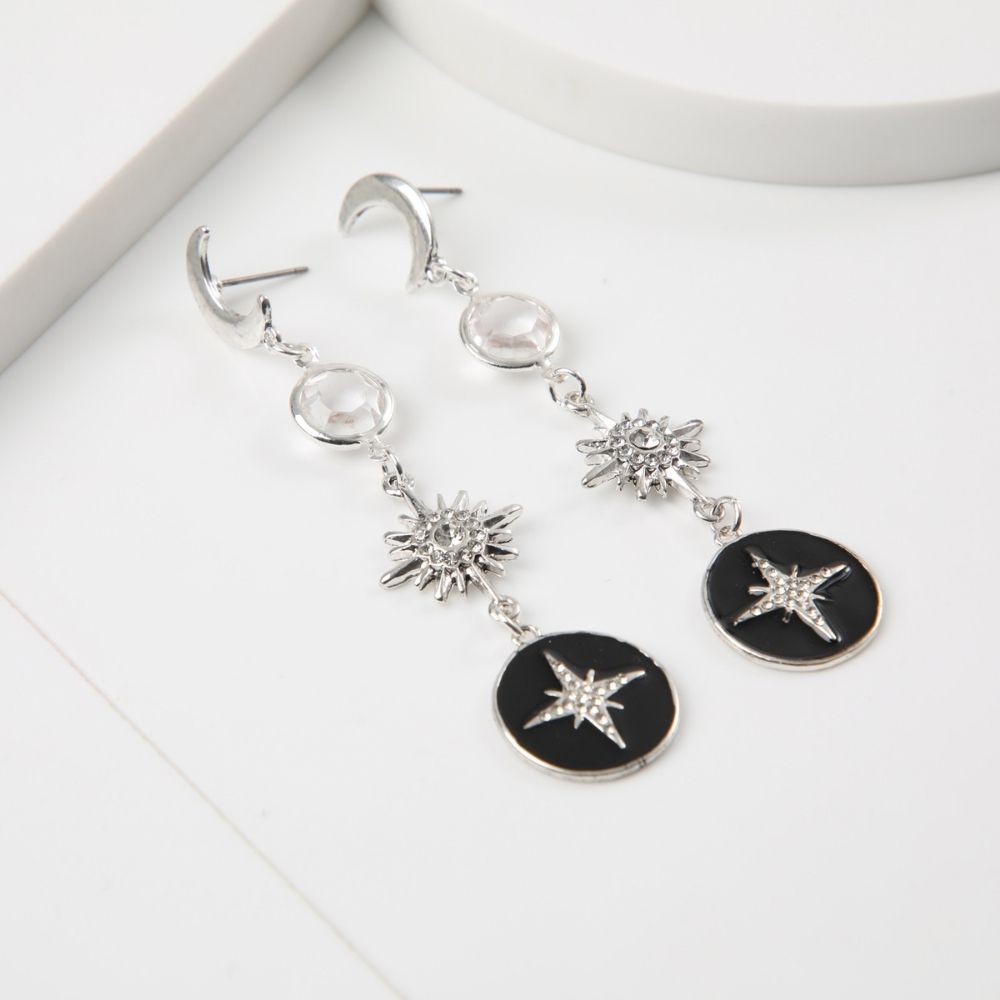 Aros plateados colgantes con dijes de forma de luna, de sol y redondo con una estrella de brillantes de fantasía sobre fondo negro.