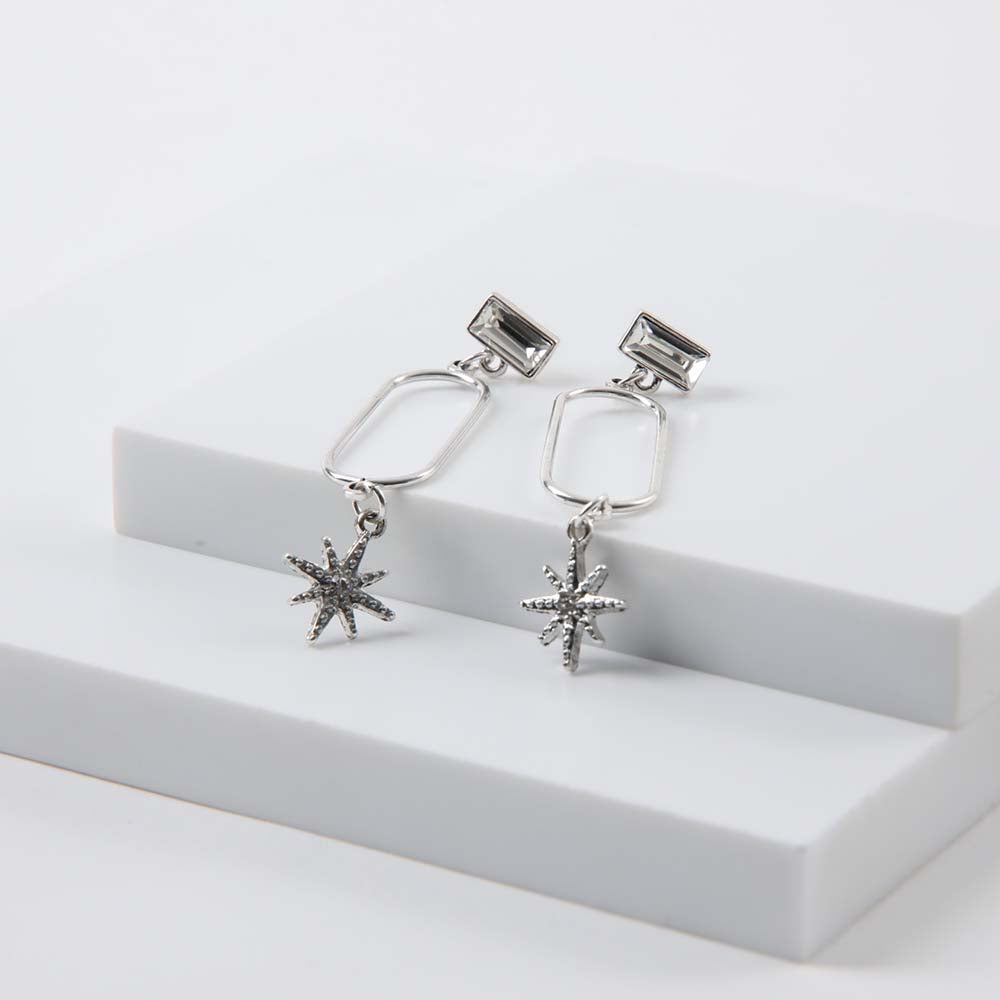 Aros colgantes con base de brillante de fantasía rectangular del que se desprende un rectangulo dorado con un dije de estrella.