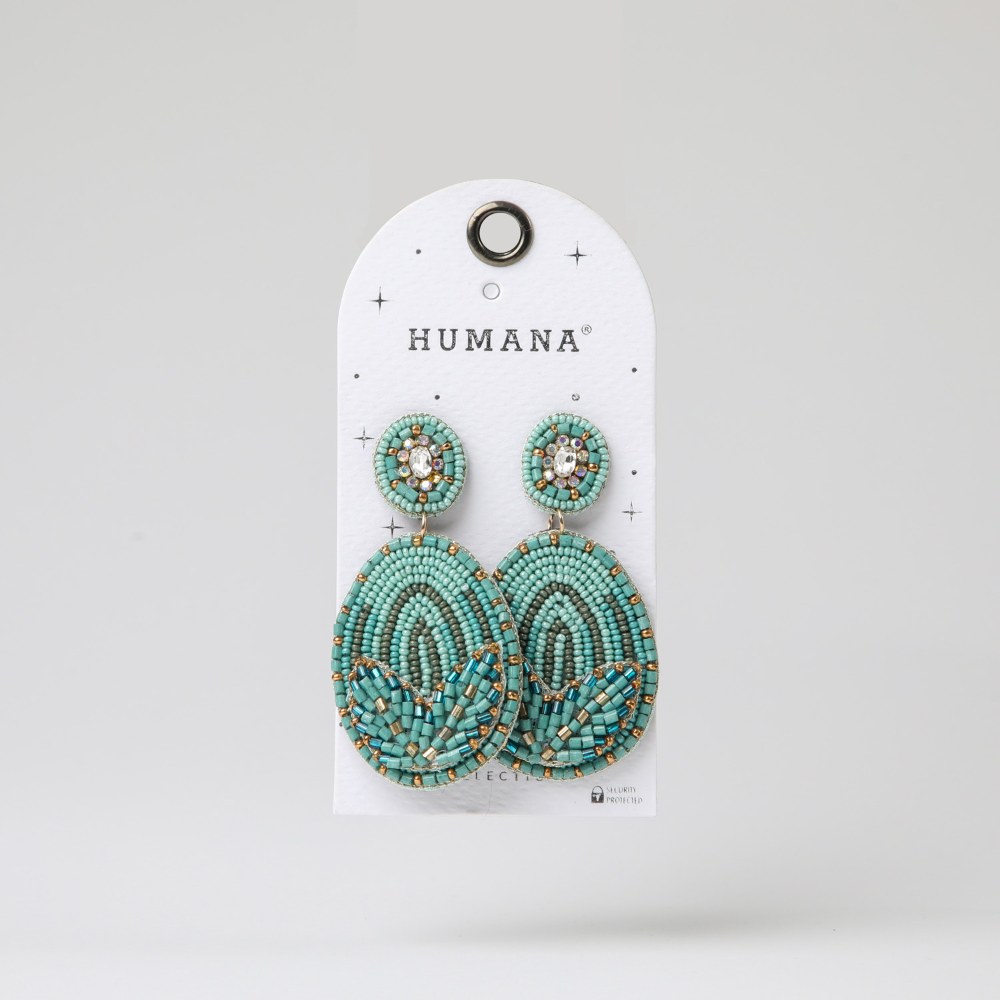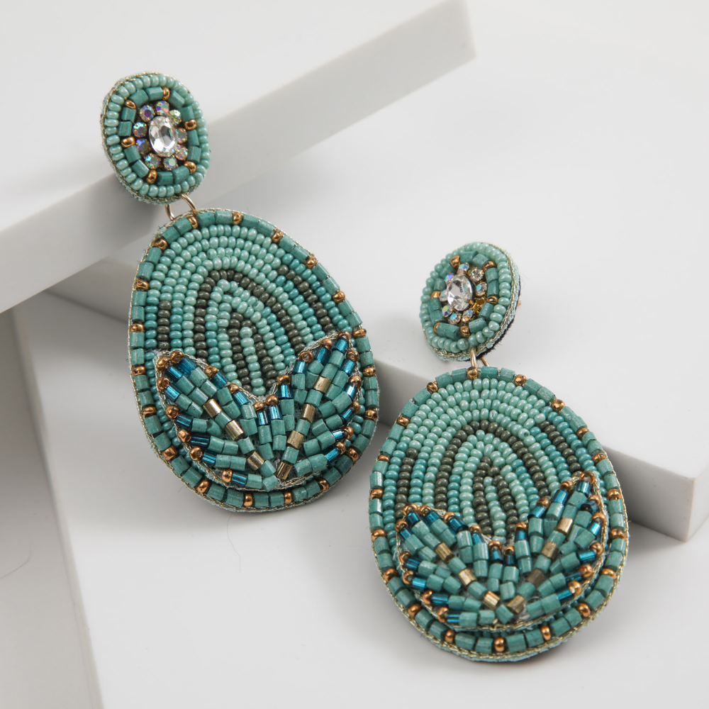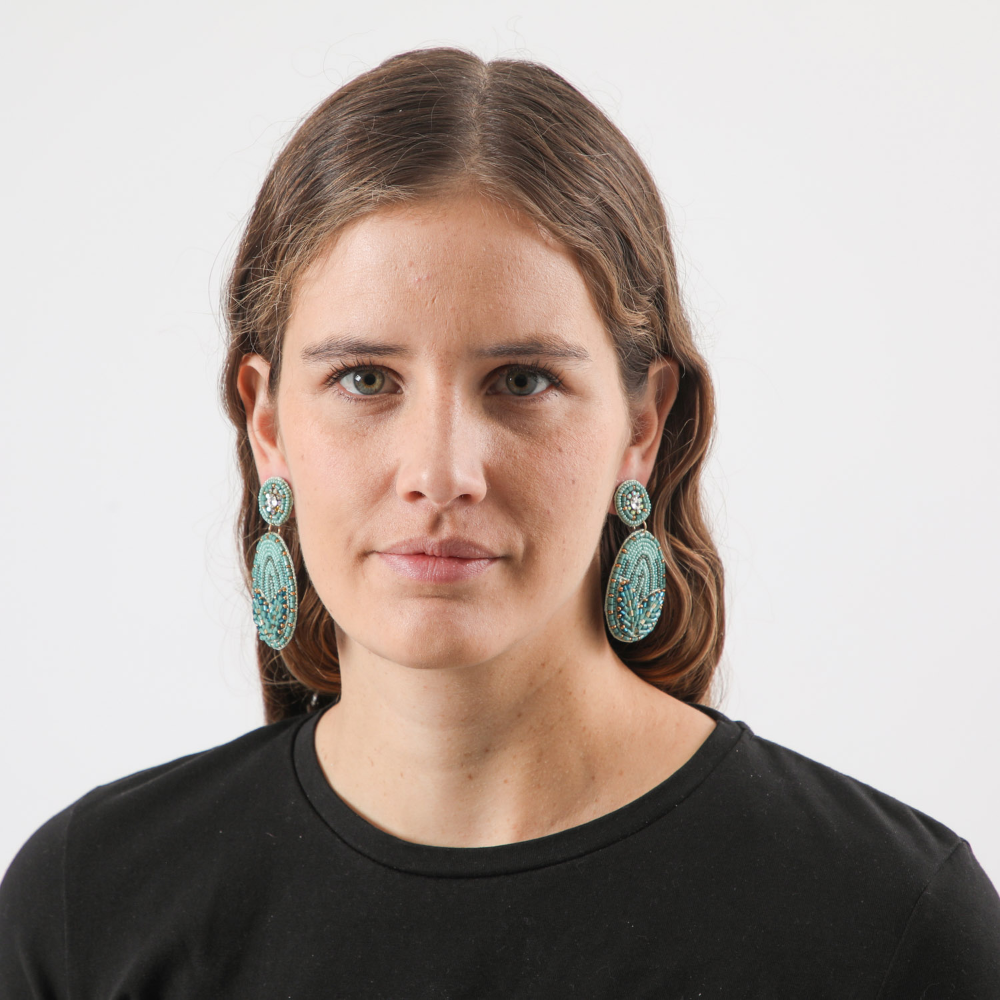 Aro colgante de dos partes con base redonda con brillantes de fantasía rodeadas por un conjunto de mostacillas celestes y doradas. Tiene un conjunto de mostacillas celestes y doradas en forma de espiga.