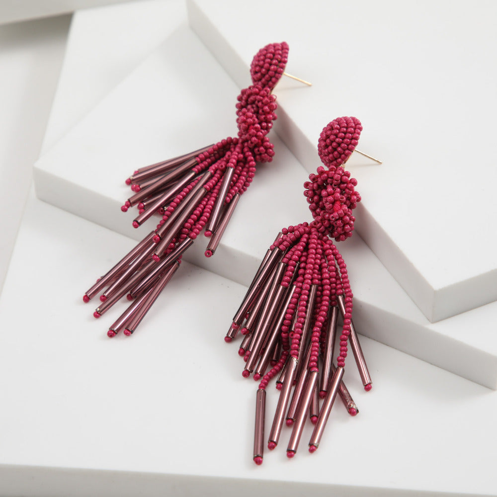 Aro largo de nudo con mostacillas redondas moradas y mostacillas largas colgantes.