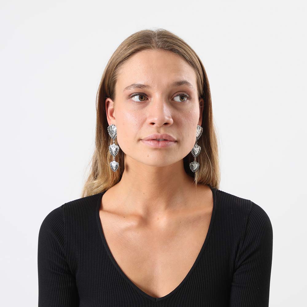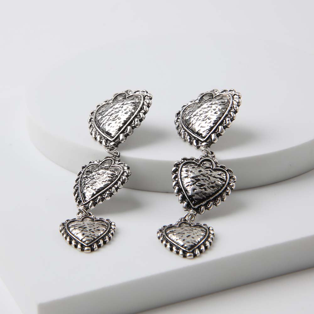 Aros colgantes plateados. Está compuesto de tres piezas en forma de corazón con efecto amartillado unidos entre sí.