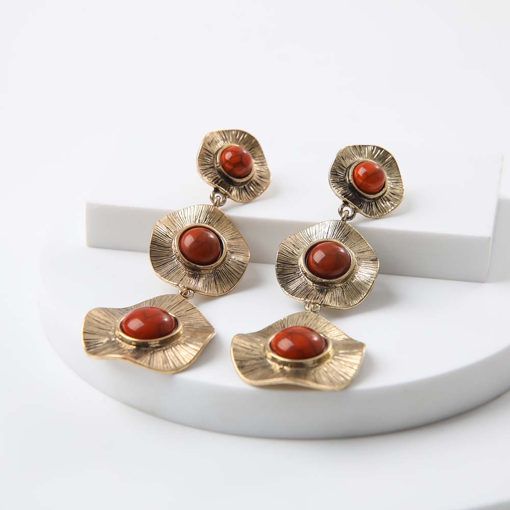 Aros colgantes dorados compuestos por tres círculos de diferente stamaños con una Piedra plastica café en el centro