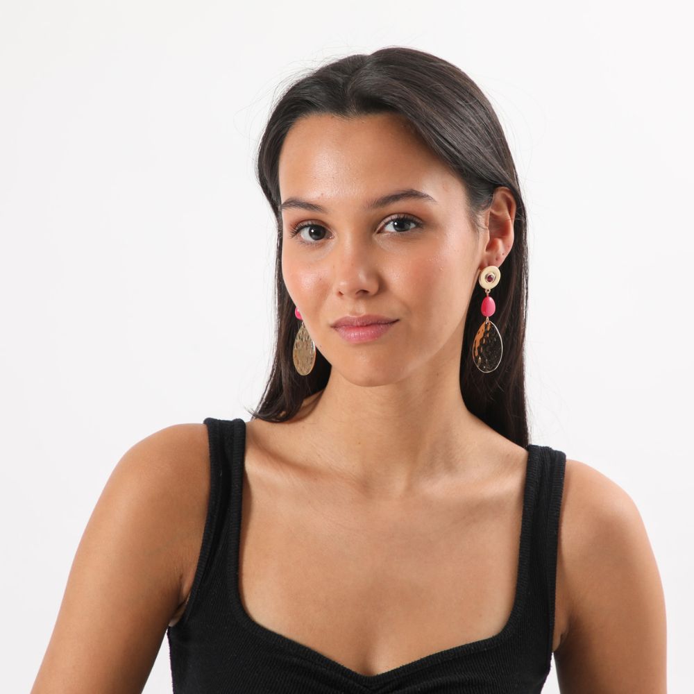 Aro largo de 3 partes con brillante de fantasía fucsia, piedra de fantasía rosada y dije dorado texturado.