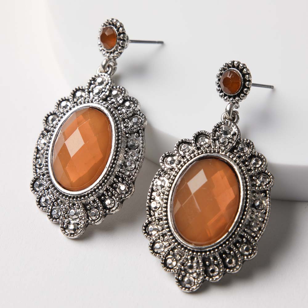 Aros Largos Humana Pitch de color naranjo que pertenece a la colección Boho Camel. Su diseño tiene una base circular pequeña con una pidra naranja, y la segunda parte cuelga es ovalada, con una piedra naranja faceteada al centro y detalles de rhinestones