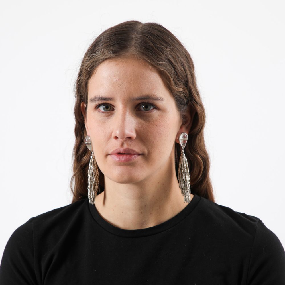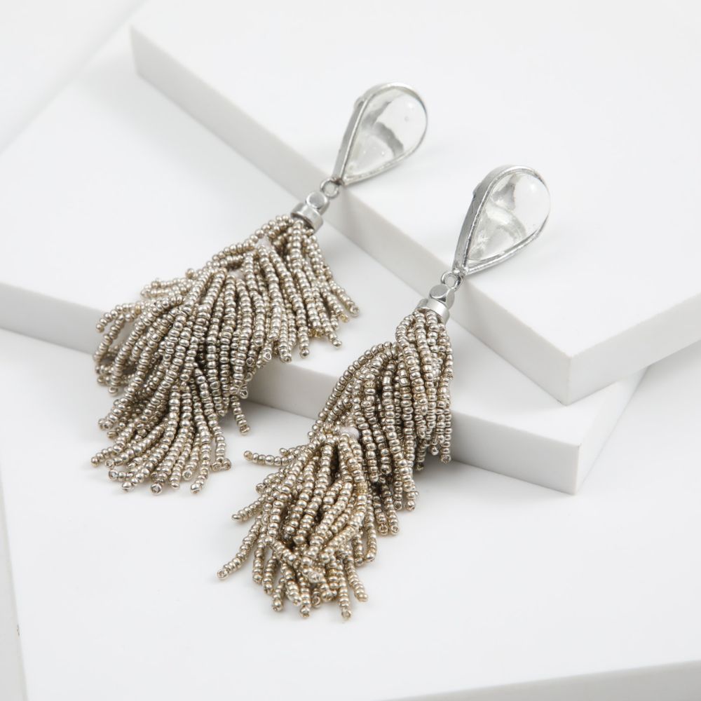 Aro largo con base de piedra transparente en forma de gota rodeada en marco de metal plateado,con flecos de mostacillas plateadas redondas.