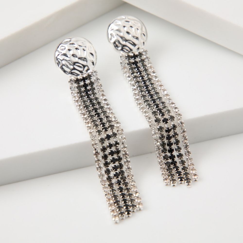 Aro largo de círculo machacado con cadenas de brillantes de fantasía colgando en tonalidades blancas, gris y negro.