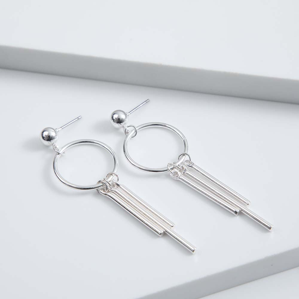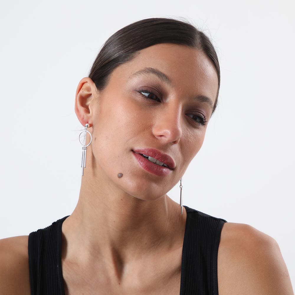 Aro Largo i-D Patti de color plateado. Círculo plateado del que cuelgan palos de distintos largos del mismo color.