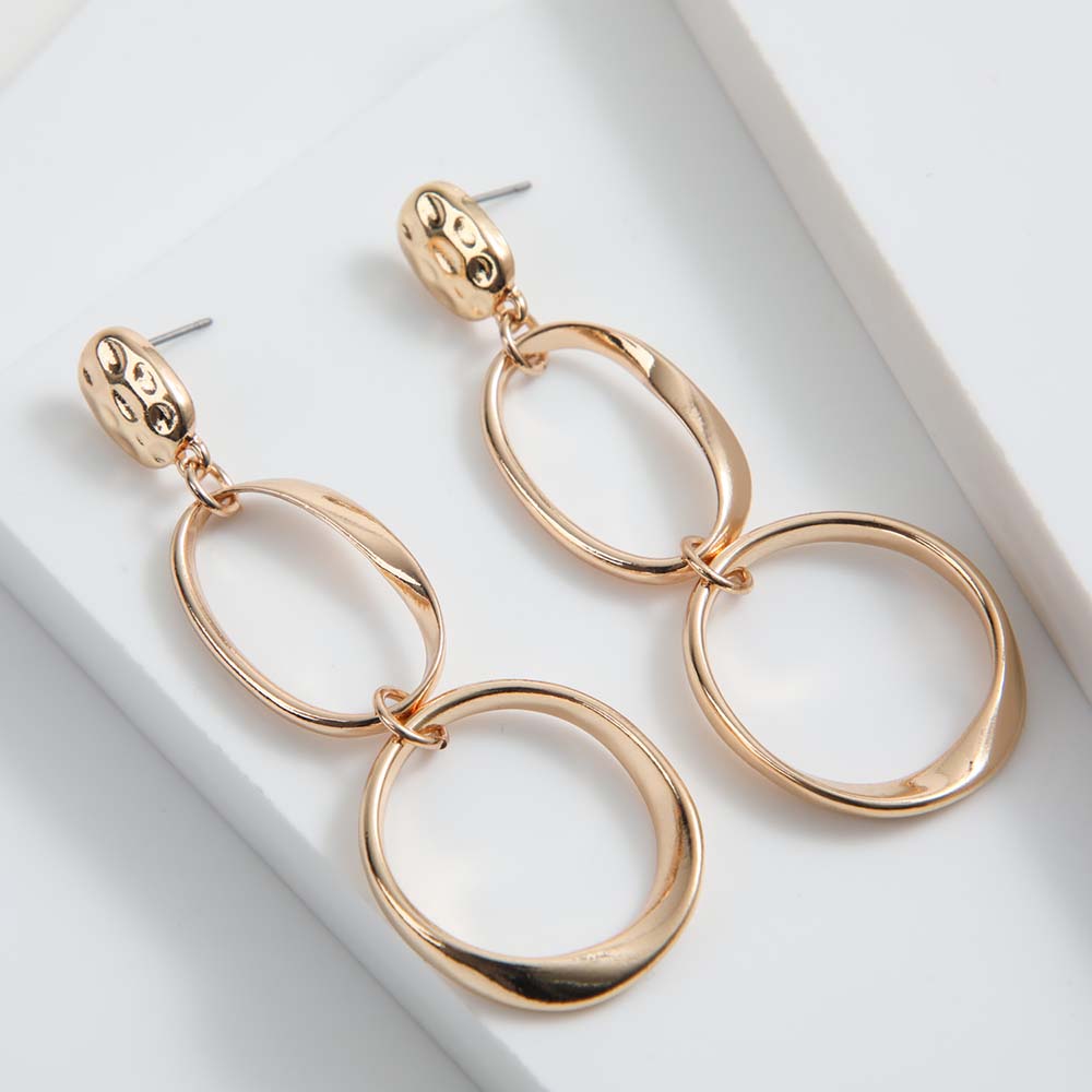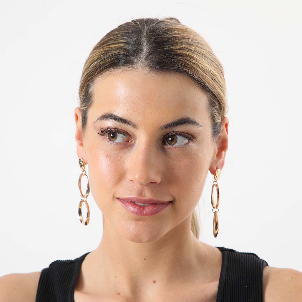 Aro Largo i-D Perugia de color dorado. Es un par de aros colgantes largos compuestos por una base circular martillada, de la que cuelgan dos argollas levemente torcidas.