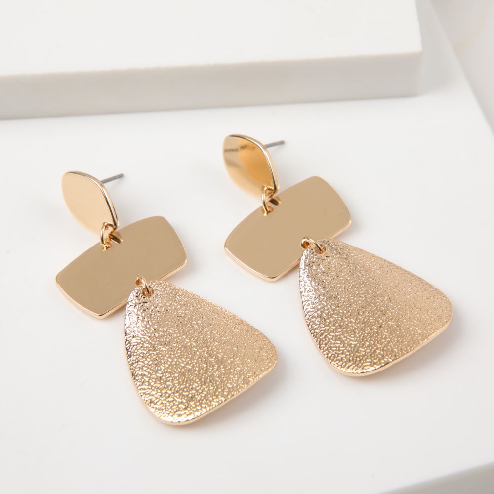 Aros grandes colgantes dorados de figuras geometricas con textura.
