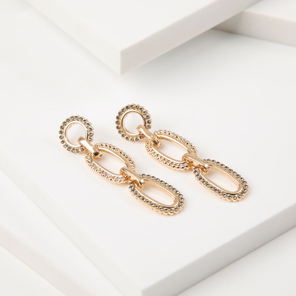 Aros largos dorados de eslabones con brillantes de fantasía pequeños grises.