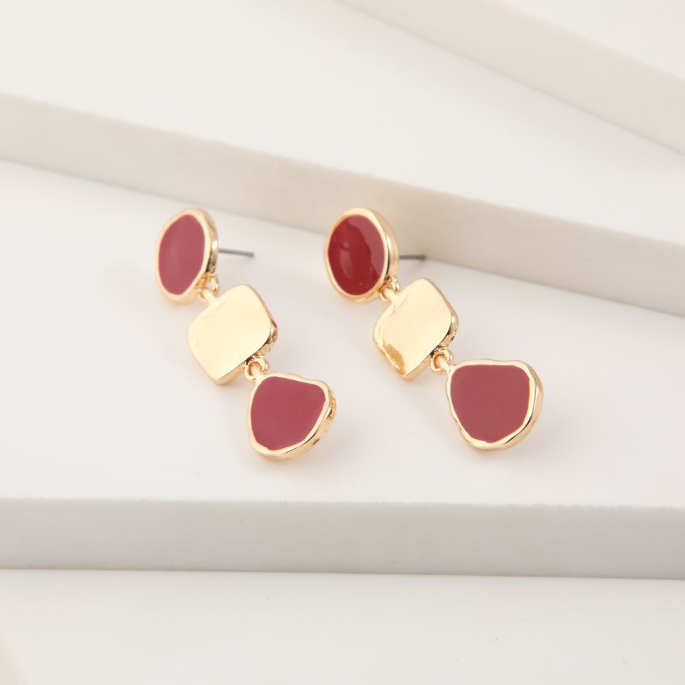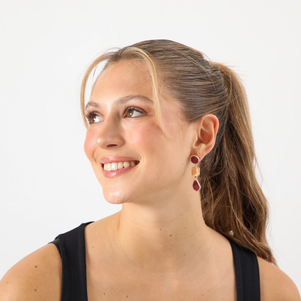 Aros largos dorados con figuras geométricas abstractras acon acabado fucsia y texturado dorado