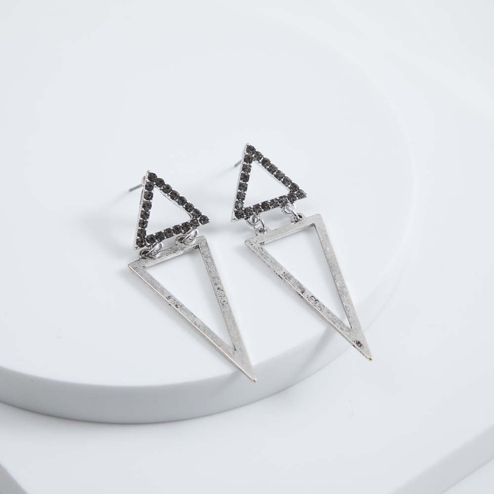 Aro Largo i-D Reed de color negro. Aros colgantes conformados por un triángulo con cristales de fantasía negros y un triángulo más grande y alargado de color plateado.