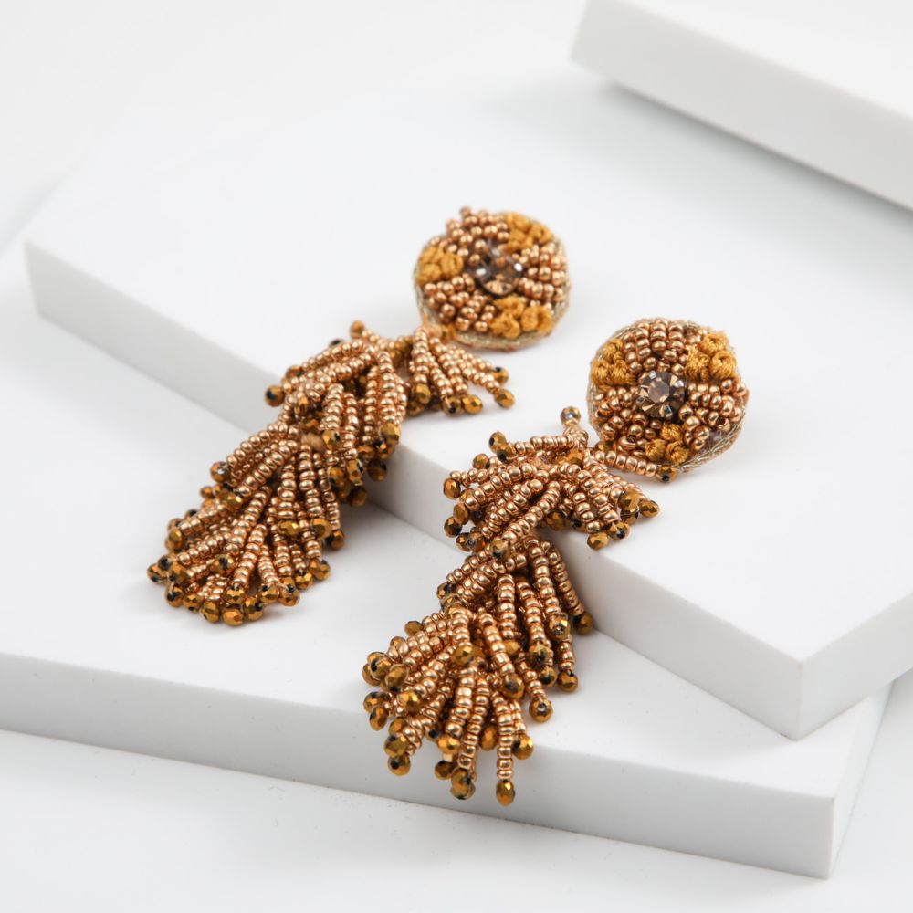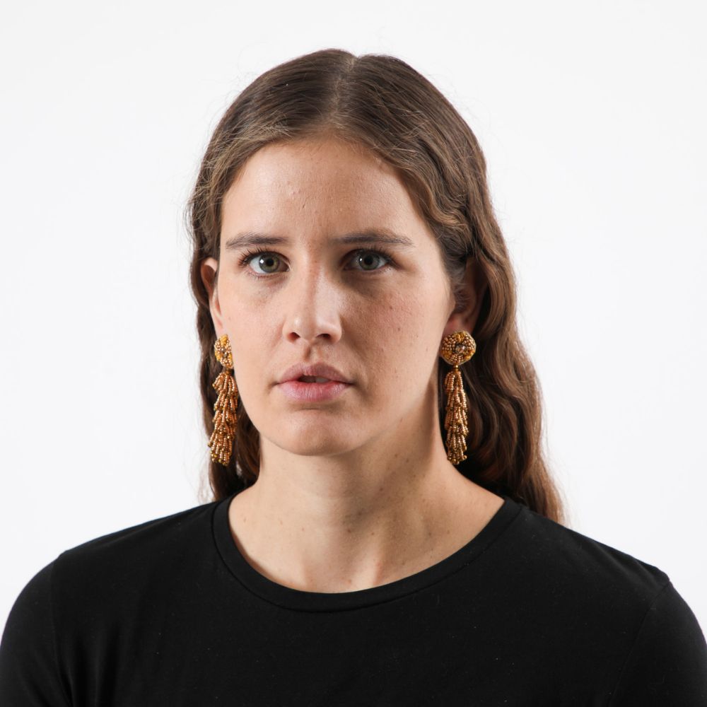 Aro largo de base circular con bordados, mostacillas y piedra brillante, seguido de flecos de mostacillas, todo en tres tonalidades de dorado.