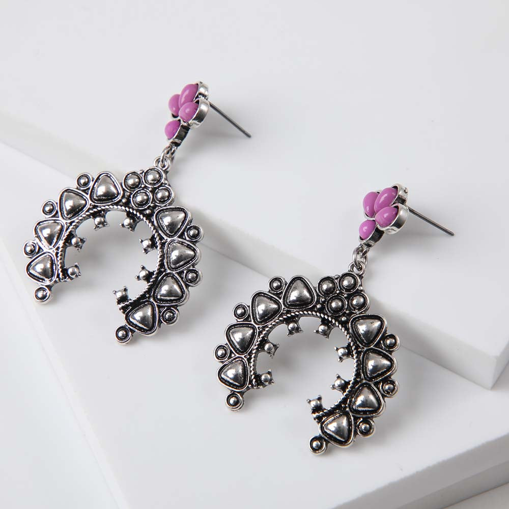 Aro Largo Humana Saúco de color rosado perteneciente a la colección Pink Diamond. Son un par de aros colgates con base de piedras rosadas de las que cuelga una pieza metalica semicircular con relieves.