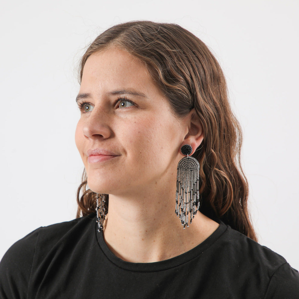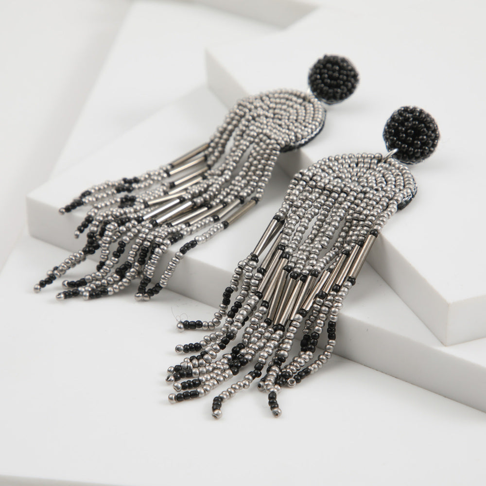 Aro largo de base redonda con flecos de mostacillas negras y plateadas.