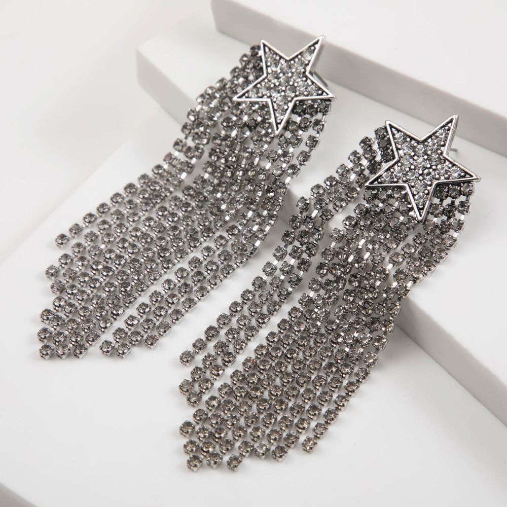 Aros largos plateados con brillantes de fantasía circulares blancos sobre estrella con flecos