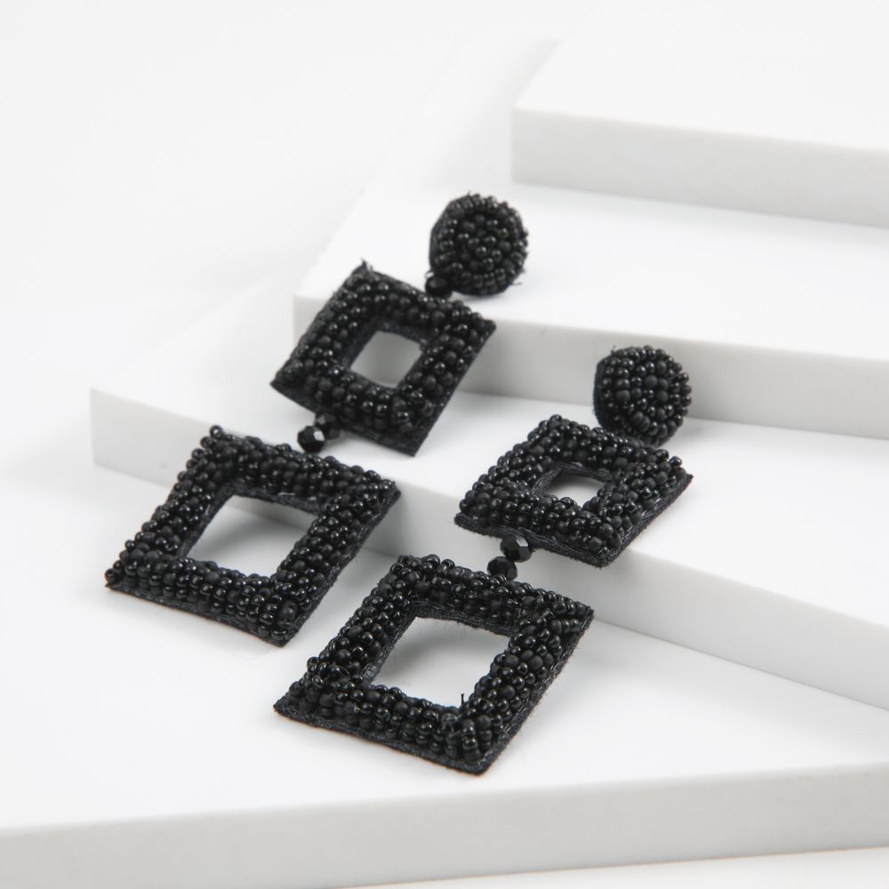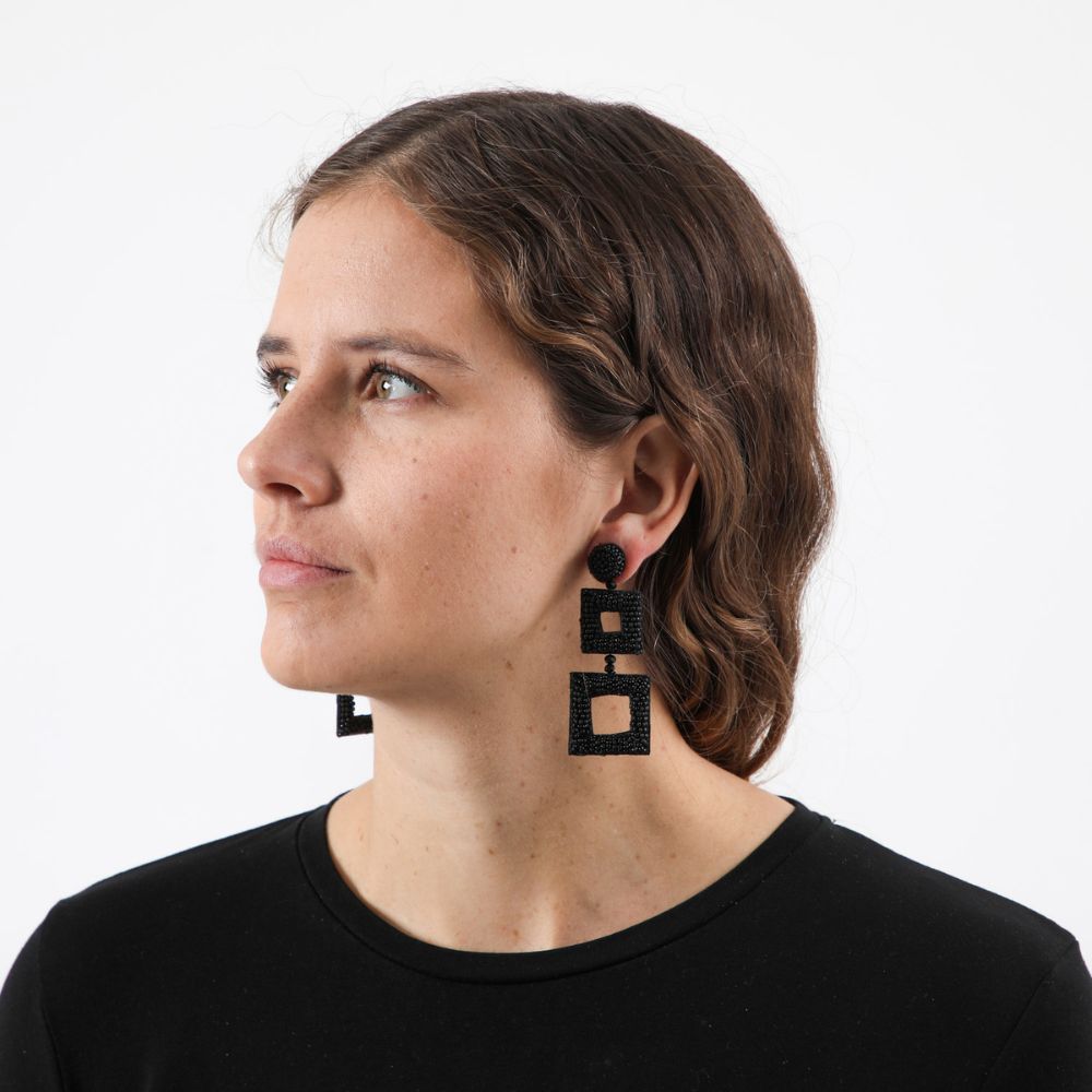 Aro largo con base circular y dos marcos cuadrados colgantes, cubierto de mostacillas negras.