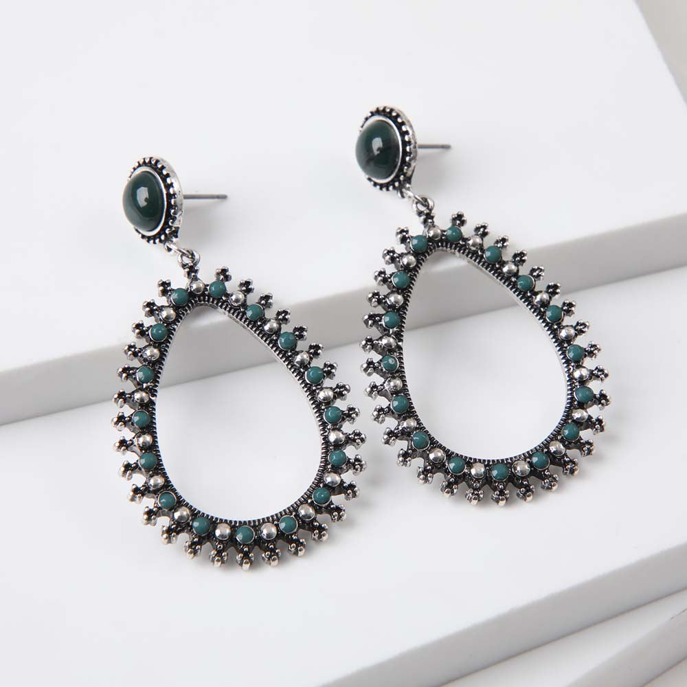 Aro Largo Humana Silene de color verde perteneciente a la colección Nephrite Green. Son un par de aros largos, la base es circular, con una piedra verde de la que cuelga una figura ovalada con piedras verdes y plateadas.