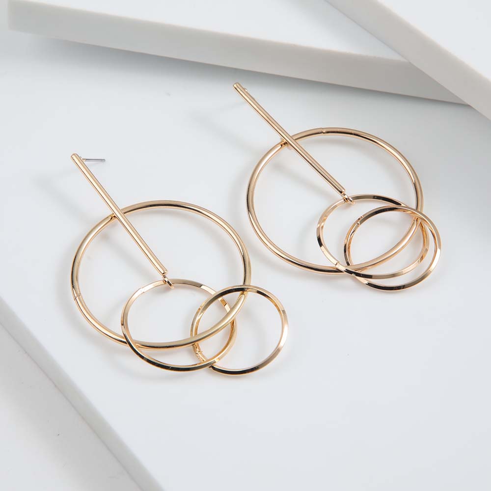 Aro Largo i-D Soda de color dorado. Aros colgantes, su base es un rectángulo alargado delgado de la que se desprenden argollas entrelazadas.