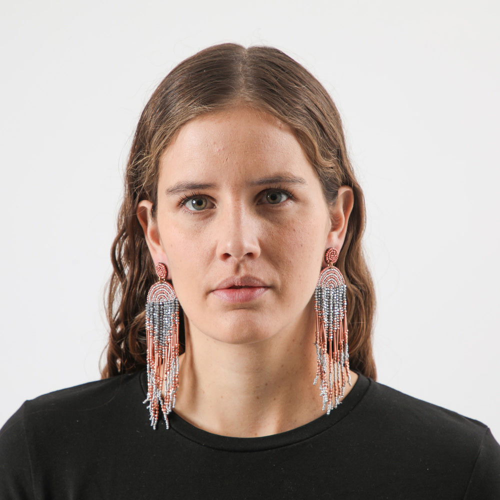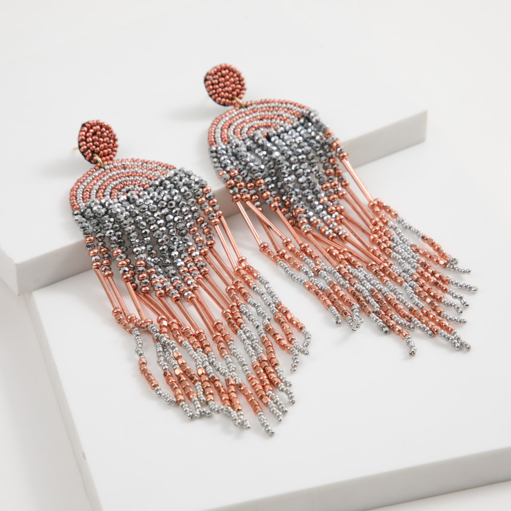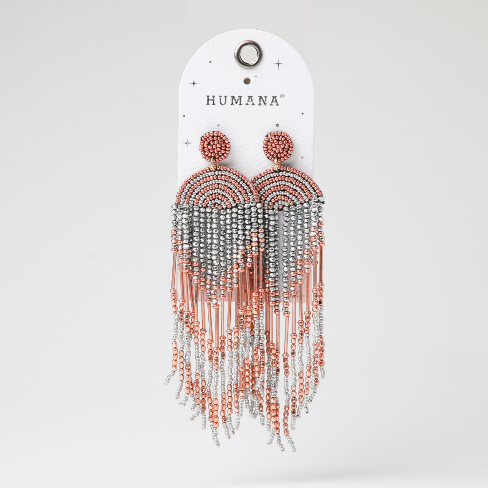 Aro largo de base redonda de mostacillas rosadas y doradas con flecos de mostacillas intercaladas.