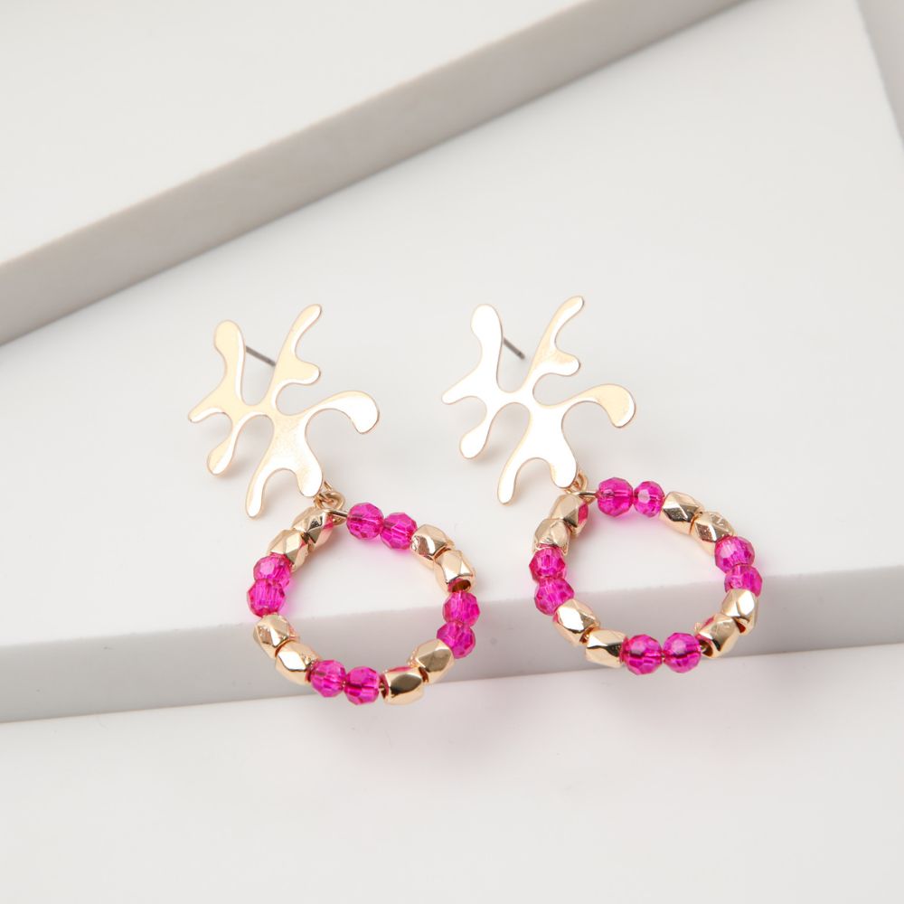 Aros medianos dorados pegados compuestos por placa en forma de alga y circunferencia de mostacillas en tonos rosados y dorados, colgando.