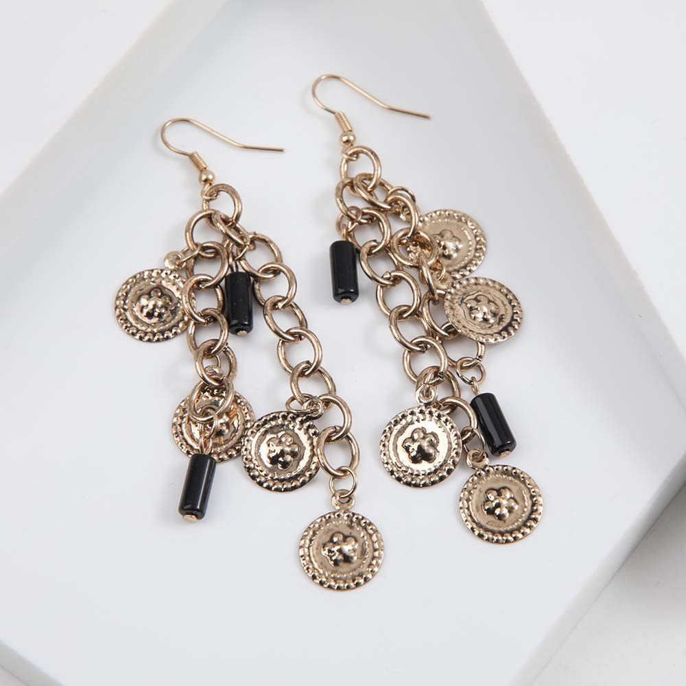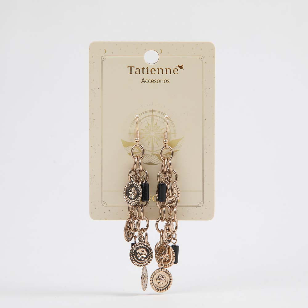 Aro Largo Tatienne Viatge de color negro perteneciente a la colección Voyage. Aros colgantes de cadenas de eslabones redondos gruesos con charms de monedas y mostacillas rectangulares negras.