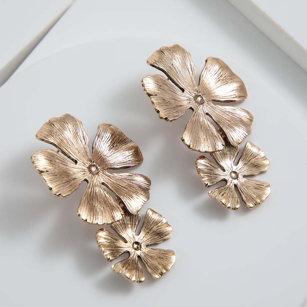 Aro Largo i-D Vibrant de color dorado. Este aro está conformado Por dos flores doradas, una grande en la base de la que cuelga por detrás una más pequeña.