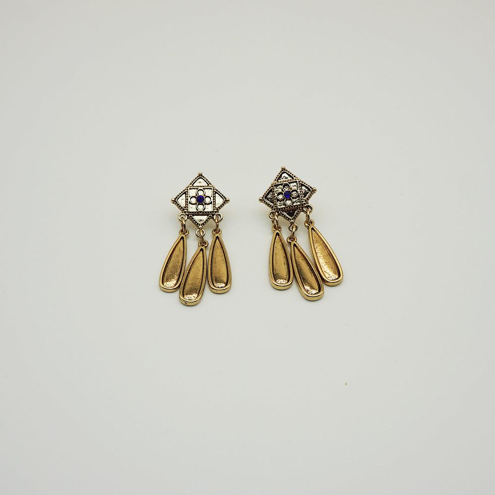 Aro Tatienne Vitral largo de color dorado que pertenece a la colección Lazuli Blue. Cuenta con una placa en forma de rombo con una flor central con una piedraazul de fantasía y colgantes en forma de gotas alargadadas.