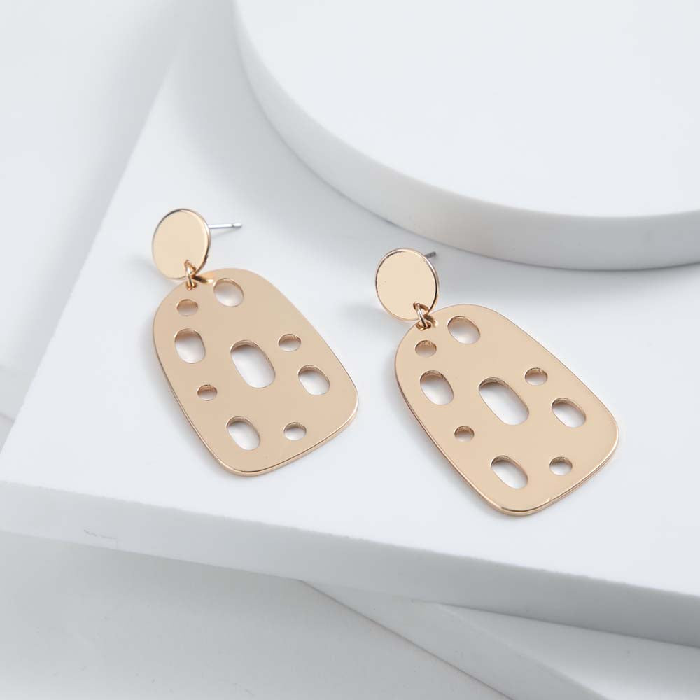 Aro Largo i-D Vittoria de color dorado. Aro colgante con base círcular de la cual se desprende una forma rectangular ovalada con orificios rectangulares.