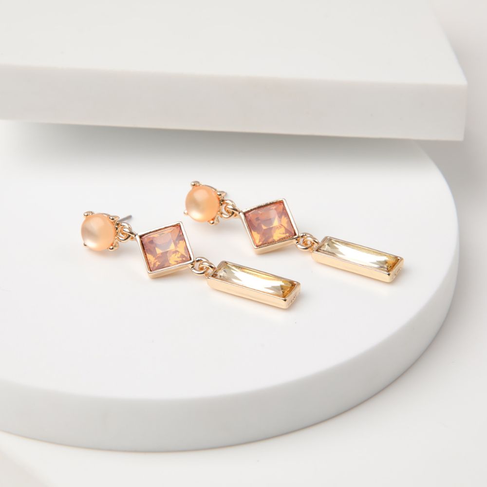 Aros medianos de piedra de fantasía circular en tonos naranjas, seguida por piedra de fantasía rosada con forma de rombo y terminado por piedra de fantasía semitransparente amarilla en forma de rectángulo.