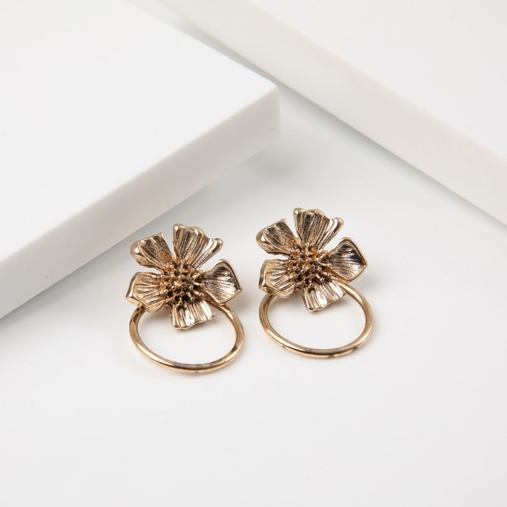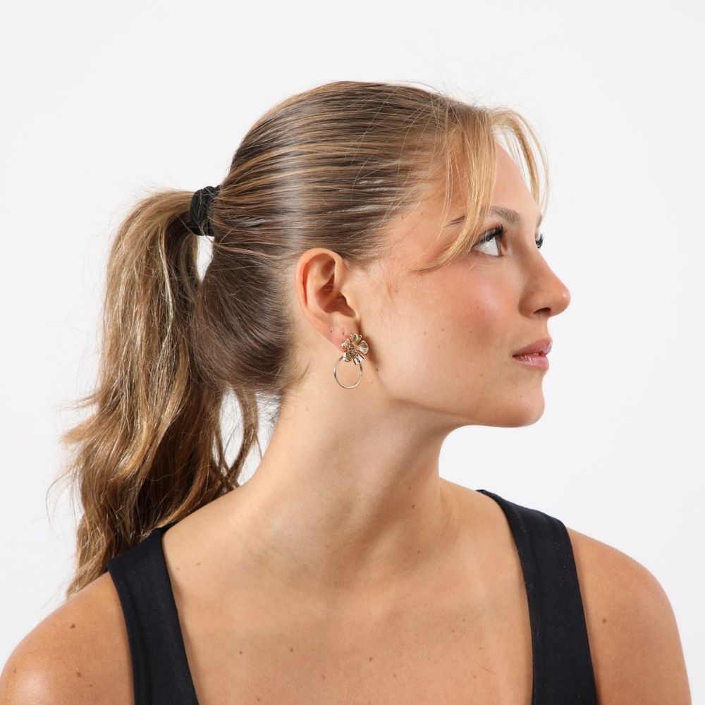 Aros dorados con flores y argollas colgantes.