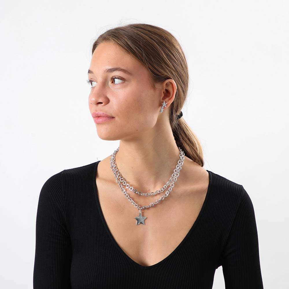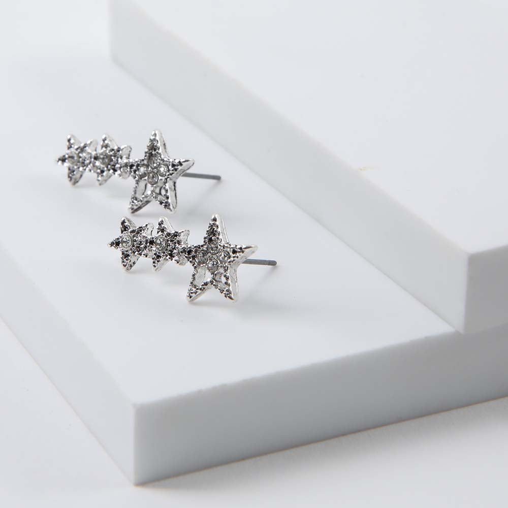 Aros colgantes plateados compuesto de estrellas de diferentes tamaños con una Piedra brillante de fantasía en el centro