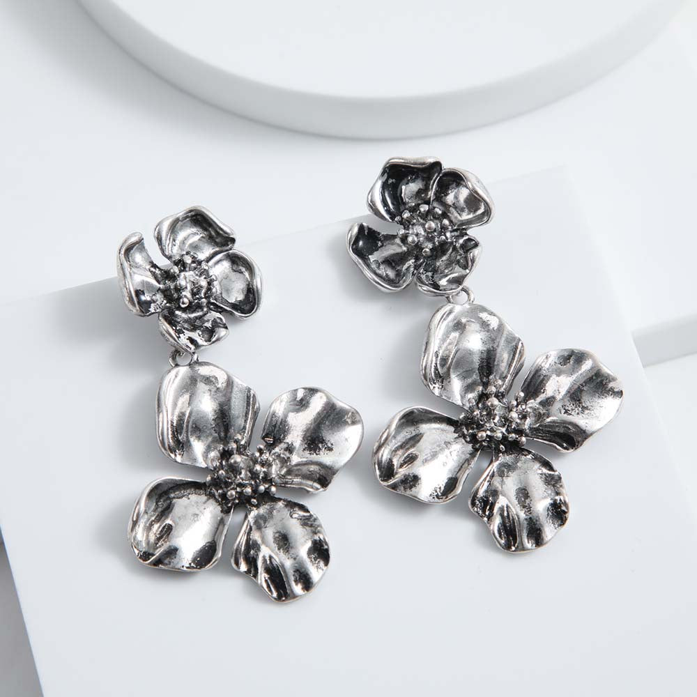 Aro Mediano Humana Epifilo de color plateado perteneciente a la colección Floral Nature. Aros colgantes formados por 2 flores plateadas texturadas.