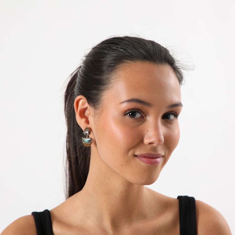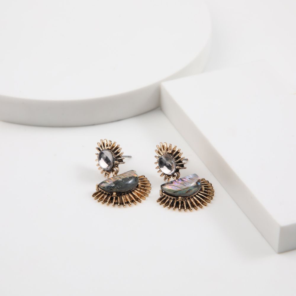 Aros medianos pegados de piedras ovaladas semitransparentes gris y semicírculos tornasol, ambos con brodes metálicos de líneas intercaladas.