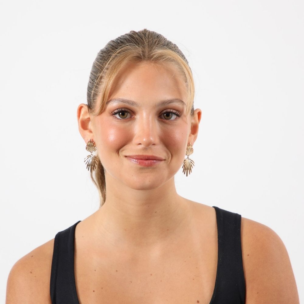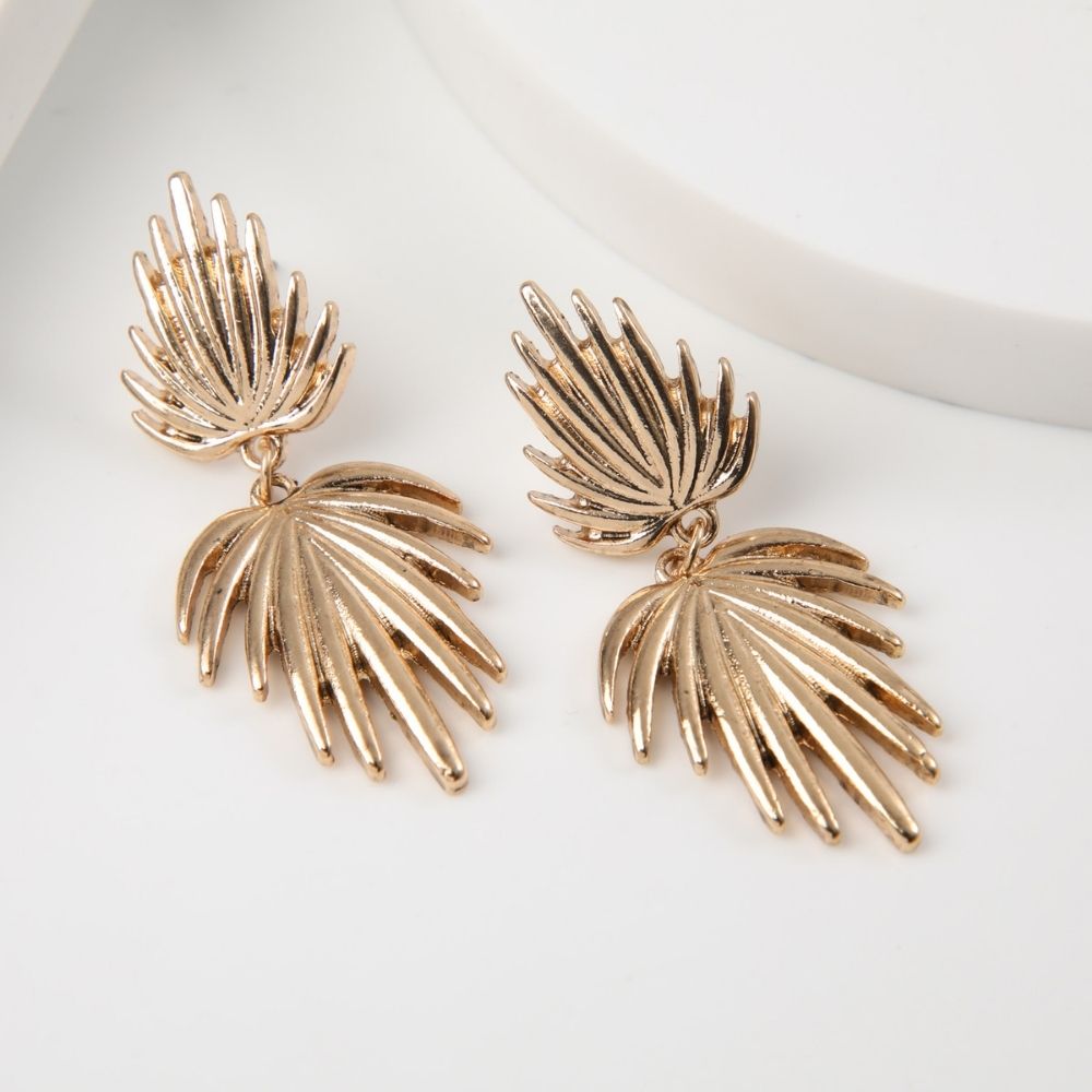 Aros dorados largos colgantes en forma de hojas hacia arriba y habia abajo.