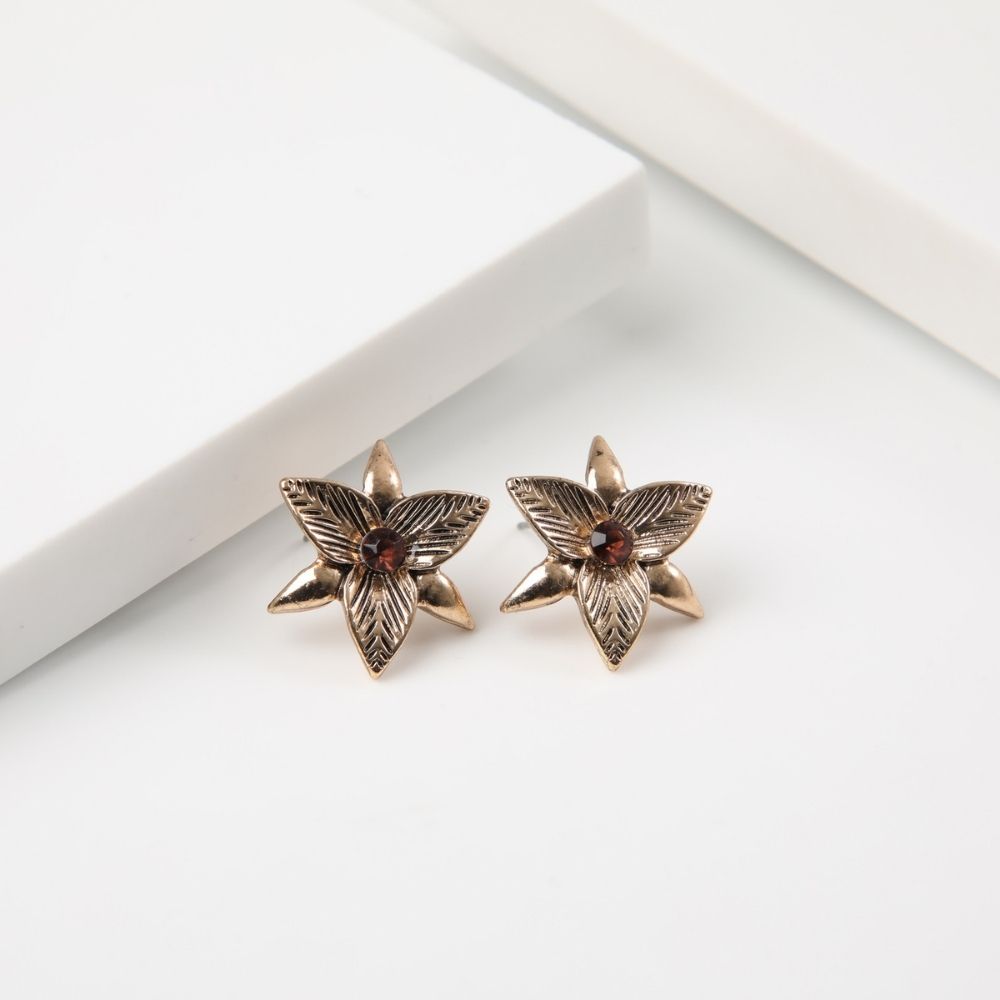 Aros dorados pegados con forma de flores con brillantes de fantasía de color morado.