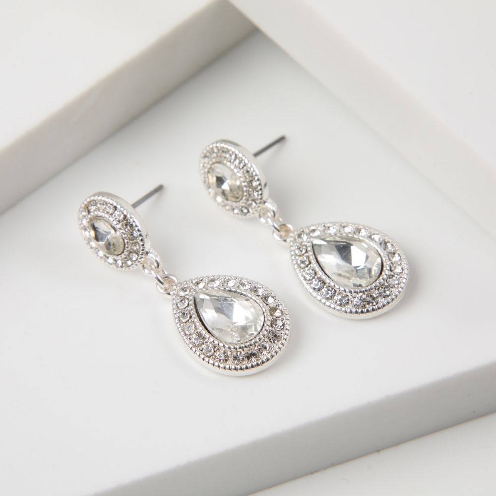 Aro colgante mediano compuesto por dos piedras semipreciosas blancas y ambas rodeadas por de brillantes de fantasía blancos.