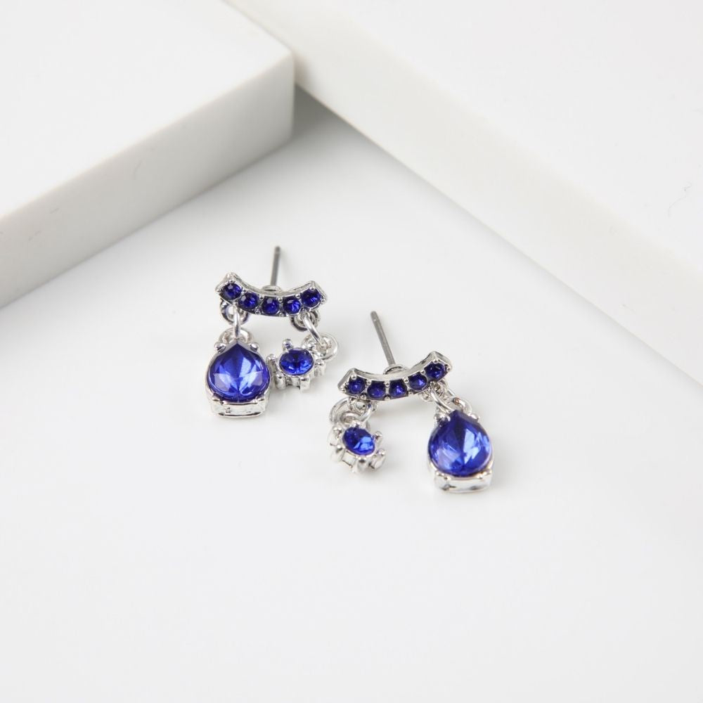 Aro pegado a la oreja en curva con brillantes de fantasía azules pegados y colgantes.