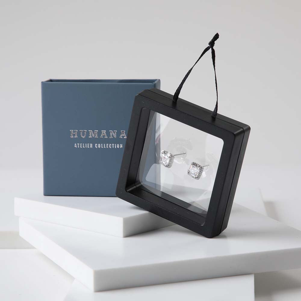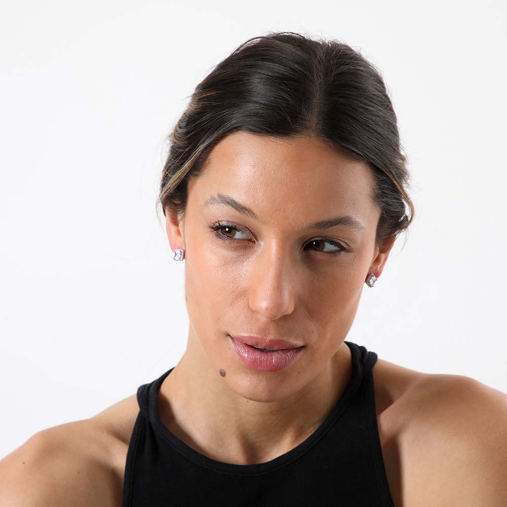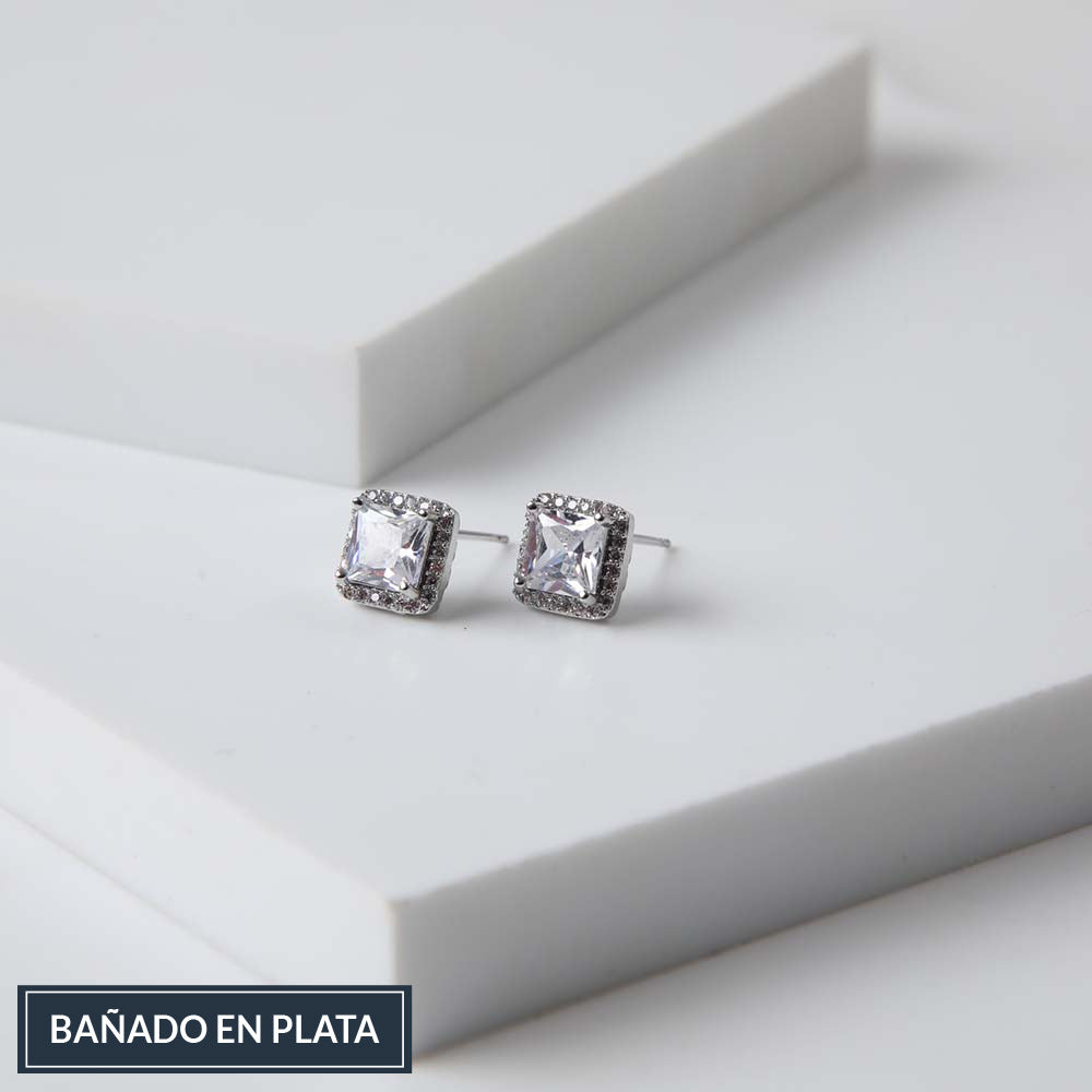 Aro Pegado Humana Lagos de color plateado perteneciente a la colección Atelier. Aros bañados en plata con forma de gota con brillantes de fantasía.