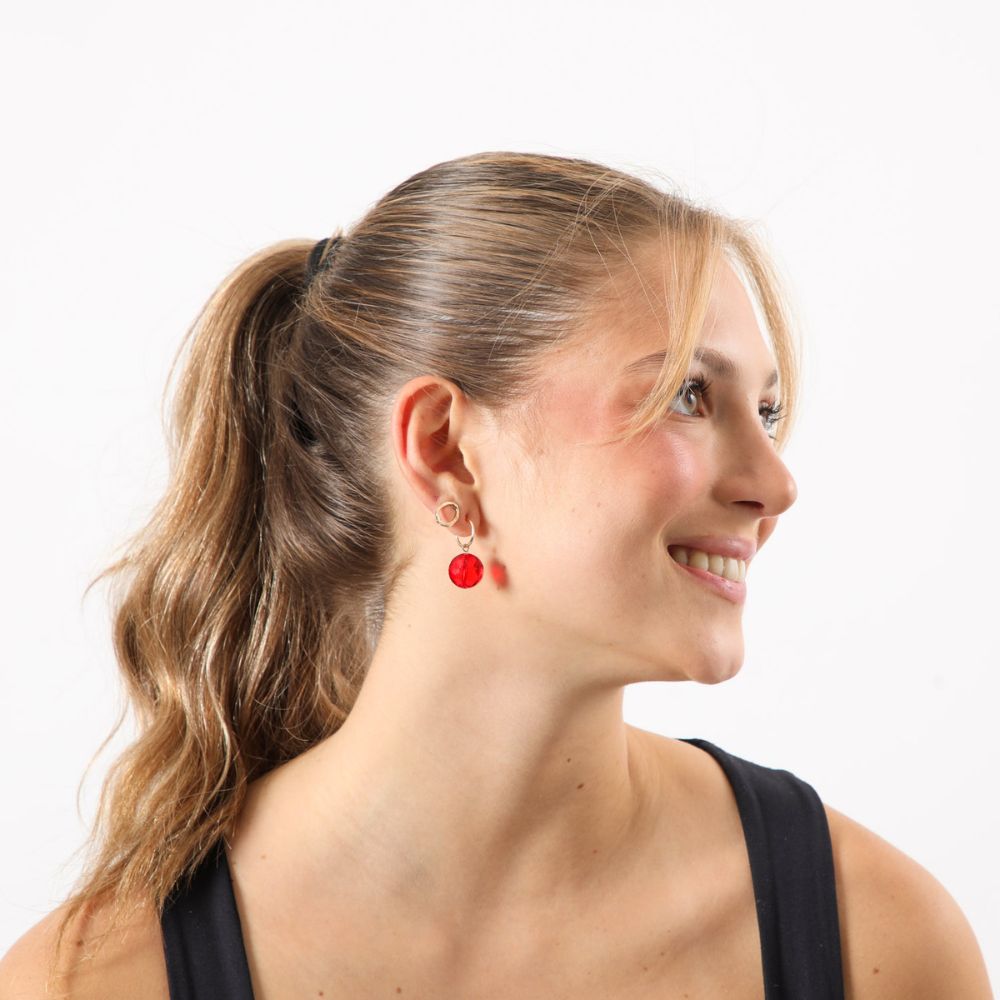 Set de dos aros metálicos dorados. Uno pequeño pegado de circunferencia irregular y otro tipo argolla simple con mostacilla grande, circular y roja como colgante.