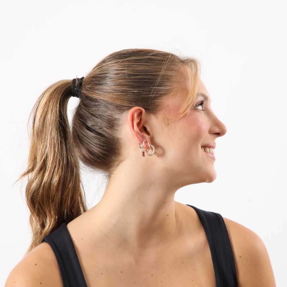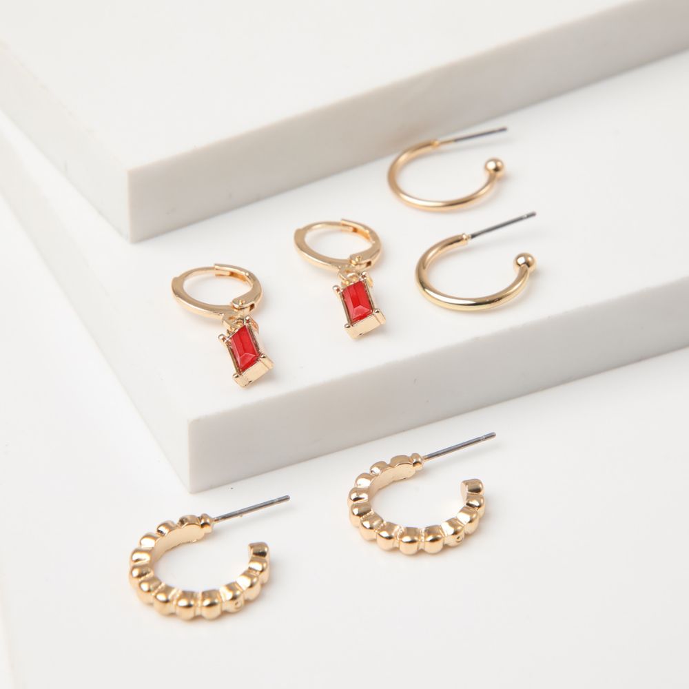 Set de tres aros tipo argolla metálicos dorados. Uno pequeño con piedra de fantasía rectangular colgando, unmediano simple y otro mediano con textura de fila de esferas pegadas.