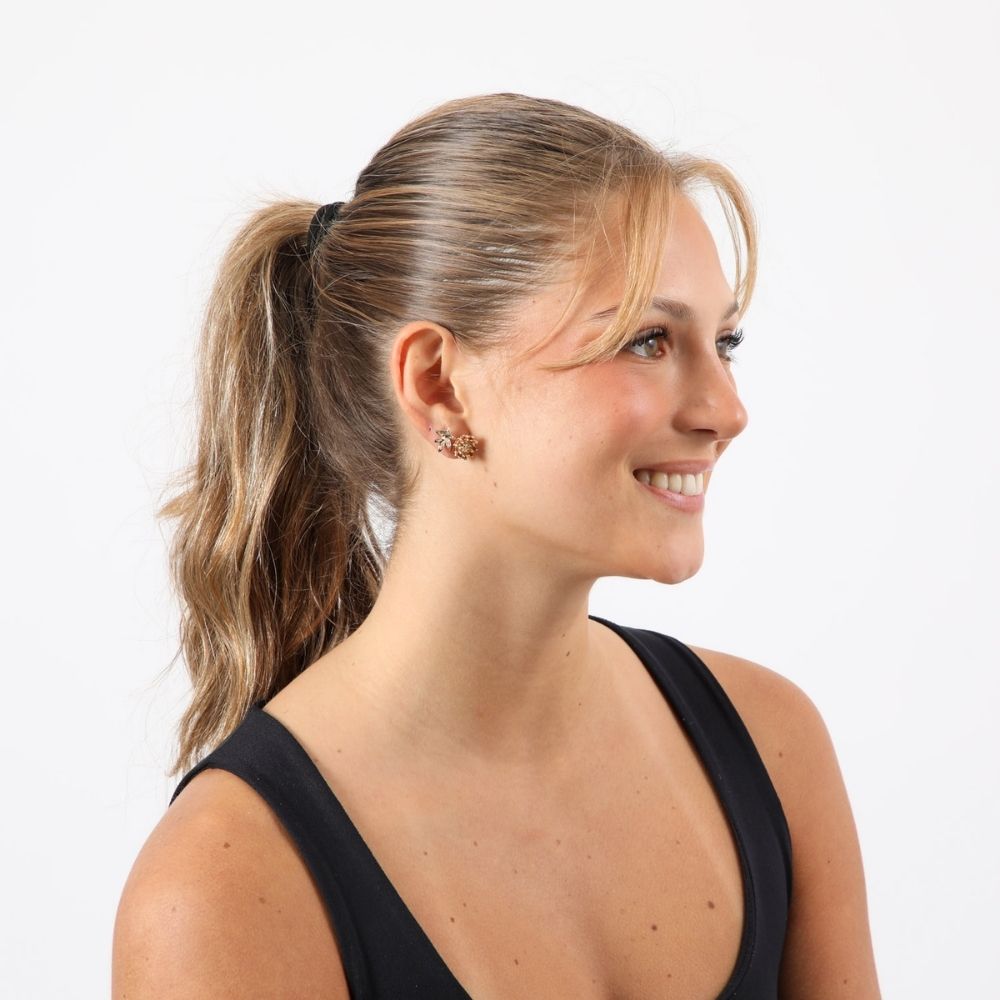 Set de aros dorados, el primer par con forma de flores y el segundo par con forma de hojas.