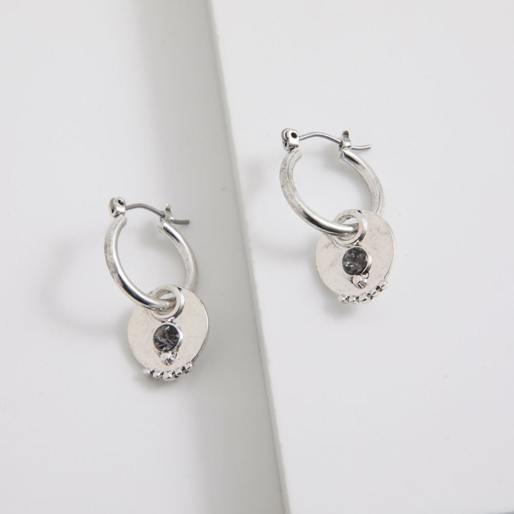 Aros Tipo Argollas Plateadas Con Dije Circular Con Una Piedra Gris De Fantasía.