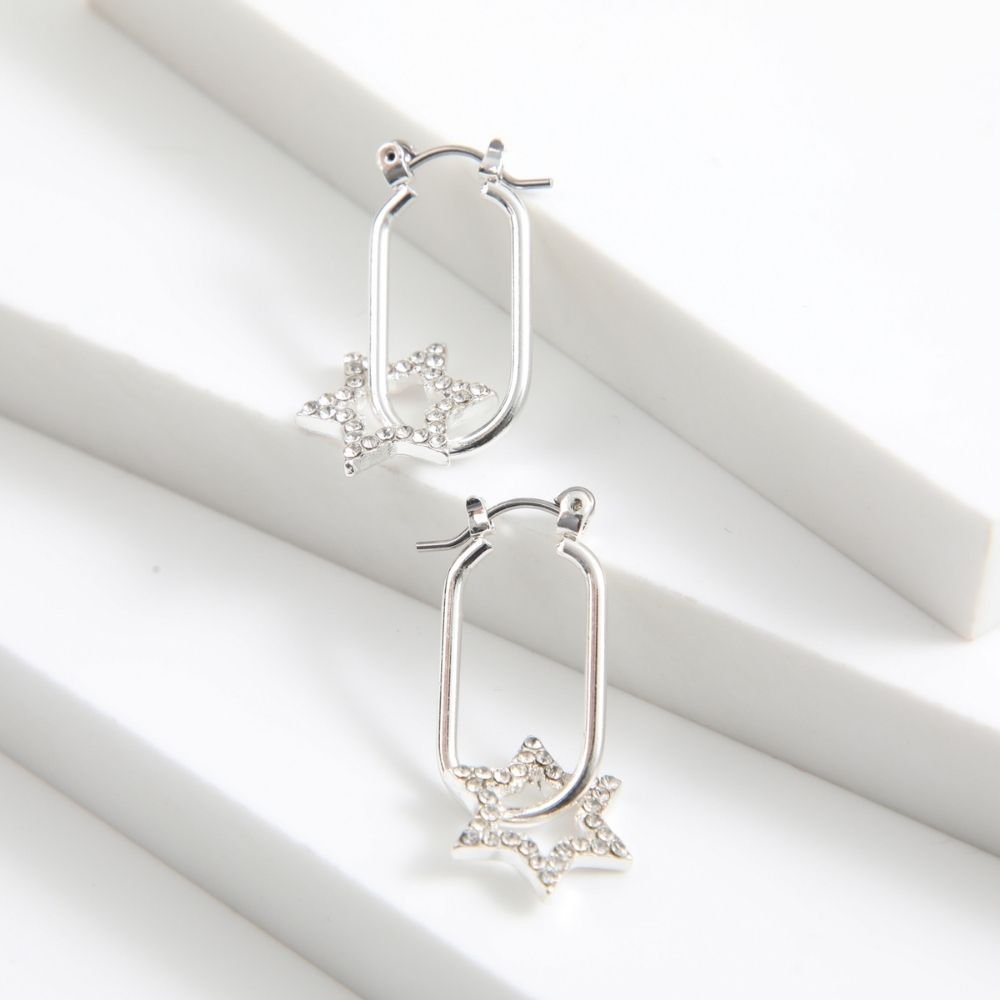 Aros De Argolla Ovalada Delgada Platada Con Dijes De Estrellas Con Brillantes De Fantasía.
