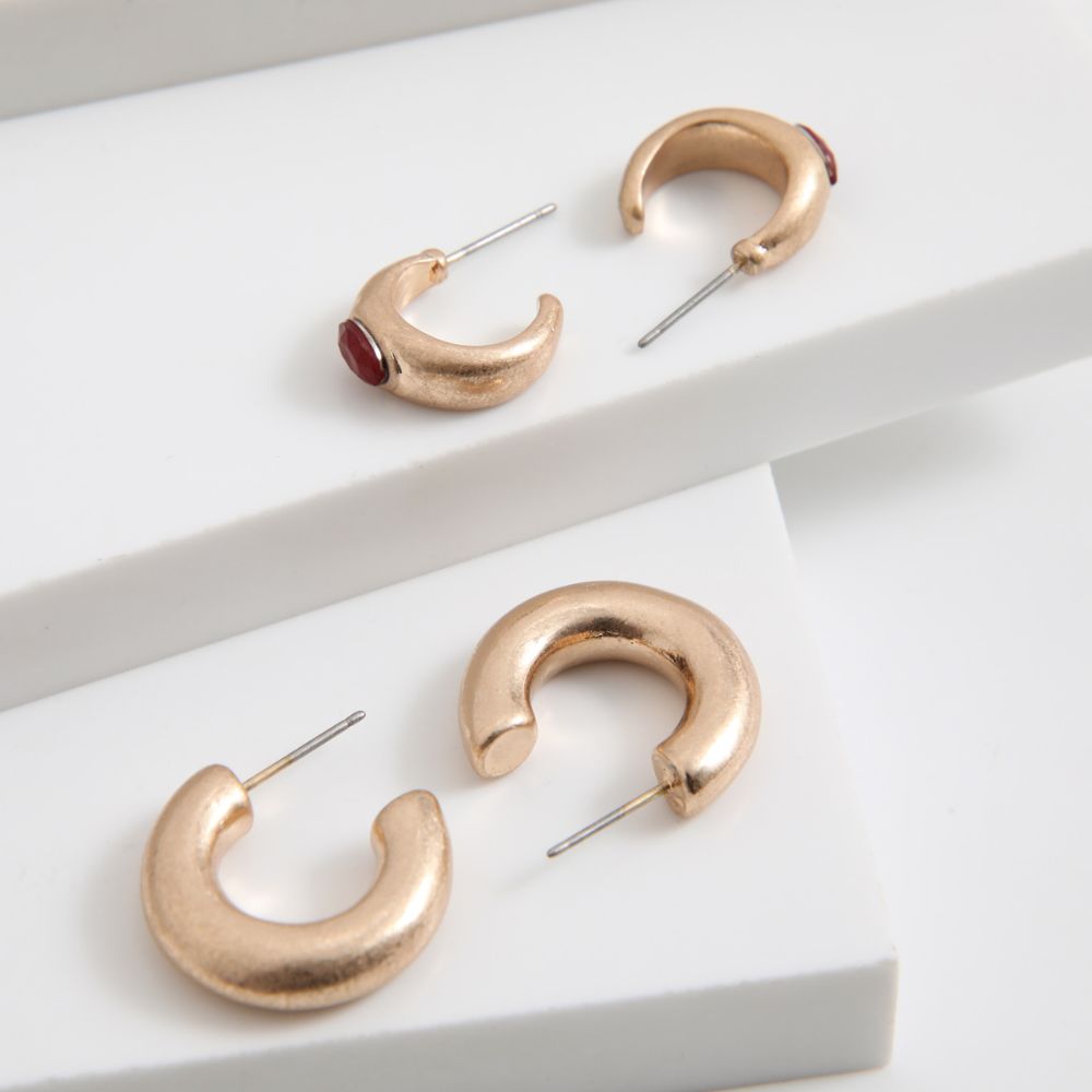 Set de aros tipo argolla, el primero tiene una piedra roja de fantasía y el segundo es gruesa y lisa.