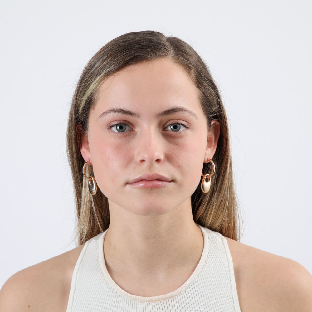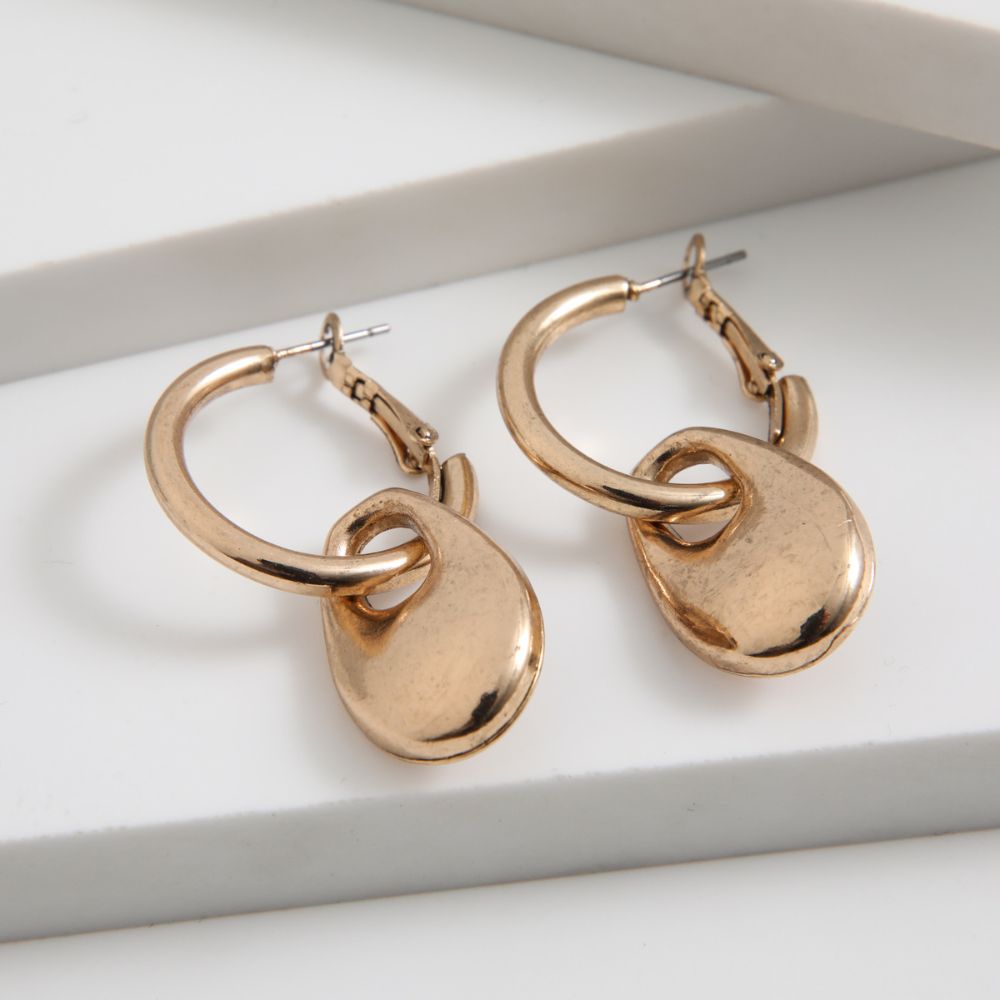 Aros tipo argollas doradas con dije ovalado.