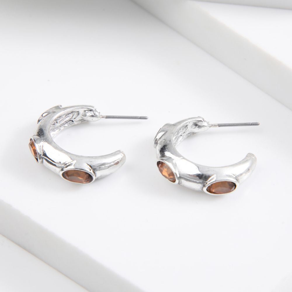 Aros tipo argolla plateado, con brillantes naranjas de fantasía.