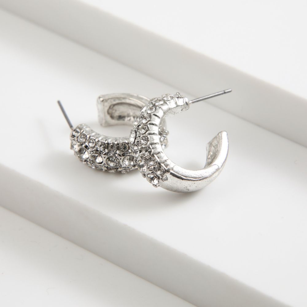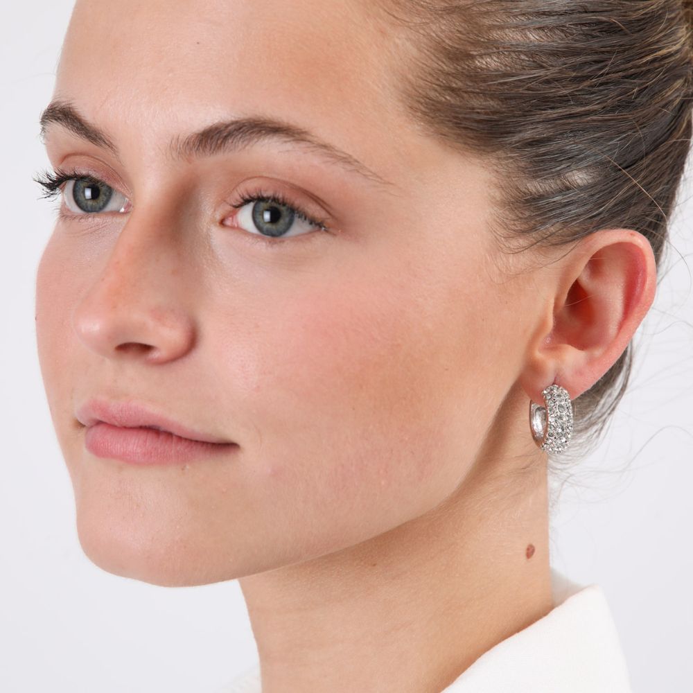 Argollas medianas anchas y gruesas en metal plateado con el frente cubierto por brillantes de fantasía blancos.