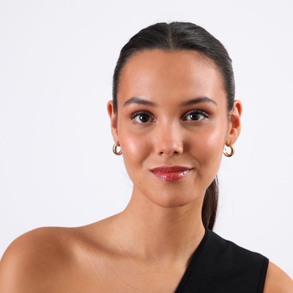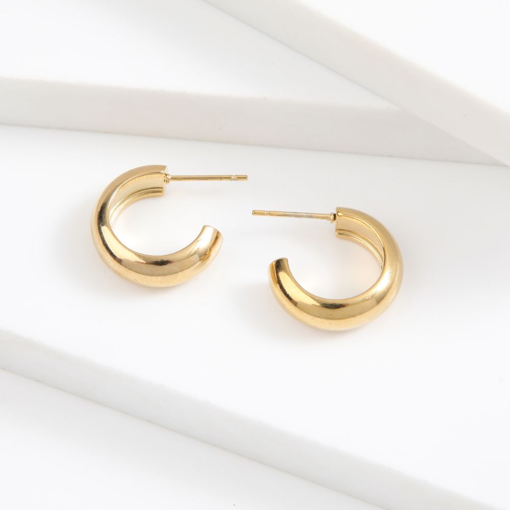 Aro tipo argolla dorada, lisa y pequeña. Es de acero y bañada en oro. Producto hipoalergénico.